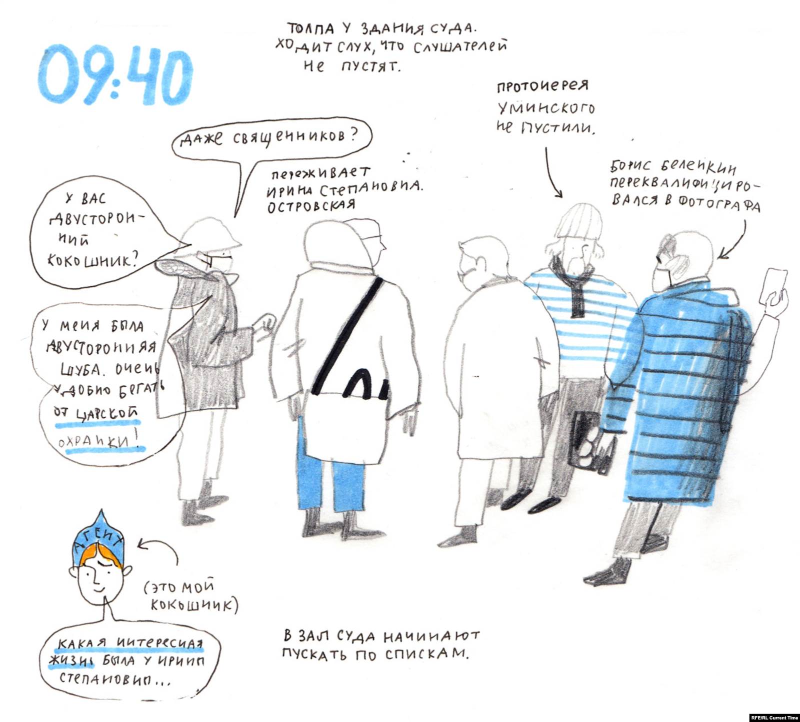 28 февраля Верховный суд окончательно ликвидировал "Международный Мемориал", оставив в силе решение, вынесенное ровно два месяца назад. По просьбе Настоящего Времени художница Катя Гущина нарисовала, что происходило на последнем заседании.